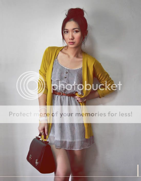. frilly stripe dress . clothes&people . mustard cardigan . gmarket . black leather bag . zipia .